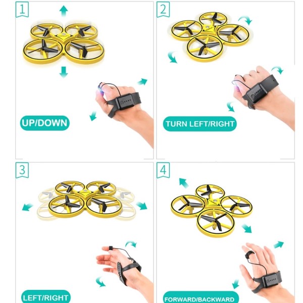 1. Subida e descida: Pressione o botão no seu dedo. O drone ajustará a altura de acordo com a mudança na altura do braço.